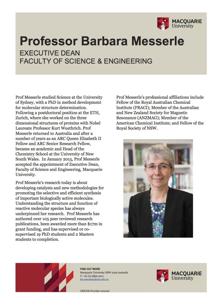 En el marco del workshop UC-McQuarie, el Centro de Investigación en Nanotecnología y Materiales Avanzados de la Universidad Católica de Chile (CIEN-UC) organizó para este martes 10 de mayo a las 11:00 hrs. una charla abierta impartida por la Dra. Barbara Messerle, Executive Dean, faculty of Science & Enginnering de la Universidad de Macquarie.