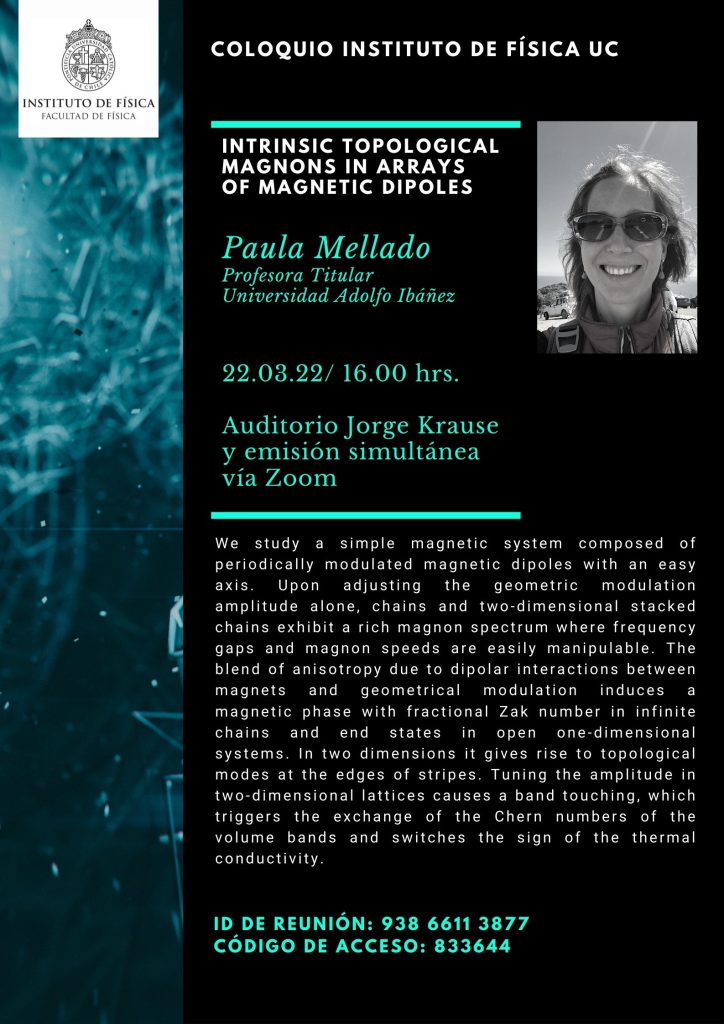 Invitamos a la comunidad del Instituto de Física a participar este martes 22 de marzo a las 16.00 horas del coloquio “Intrinsic topological magnons in arrays of magnetic dipoles”, a cargo de Paula Mellado, profesora titular de la Facultad de Ingeniería y Ciencias de la Universidad Adolfo Ibáñez.