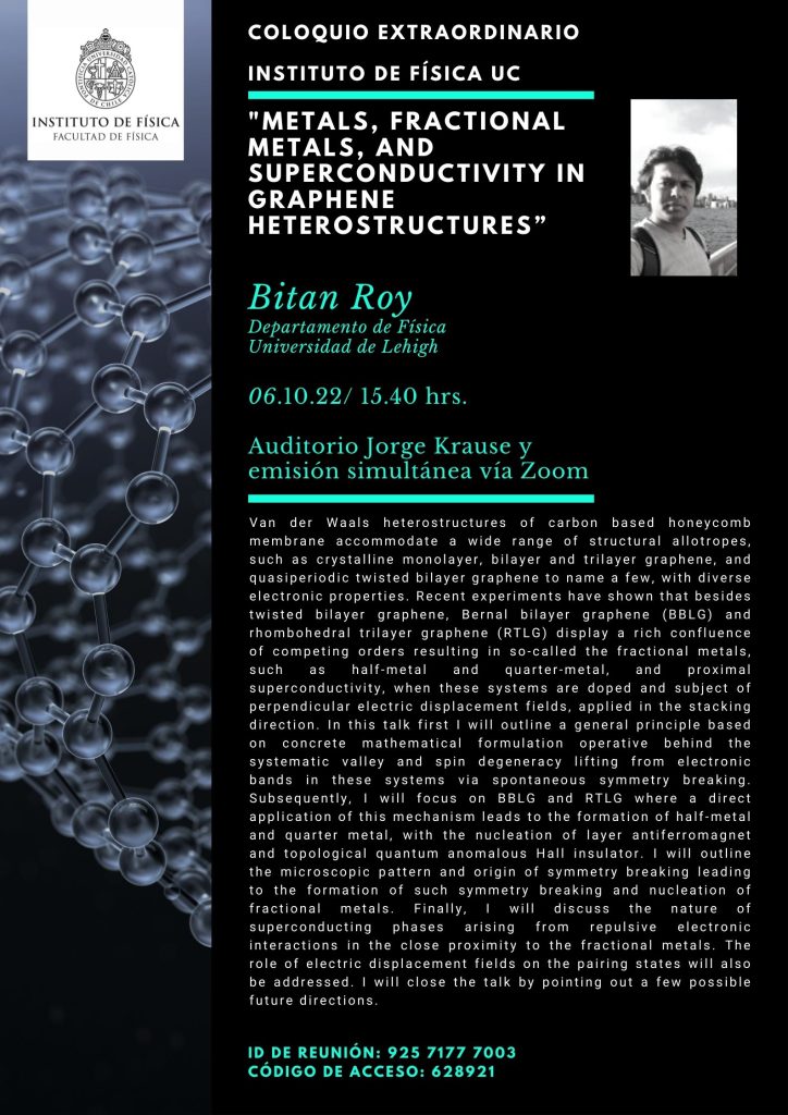 Invitamos a la comunidad del Instituto de Física a participar este jueves 6 de octubre del coloquio extraordinario: “Metals, fractional metals, and superconductivity in graphene heterostructures” por Bitan Roy, del departamento de Física de la Universidad de Lehigh.