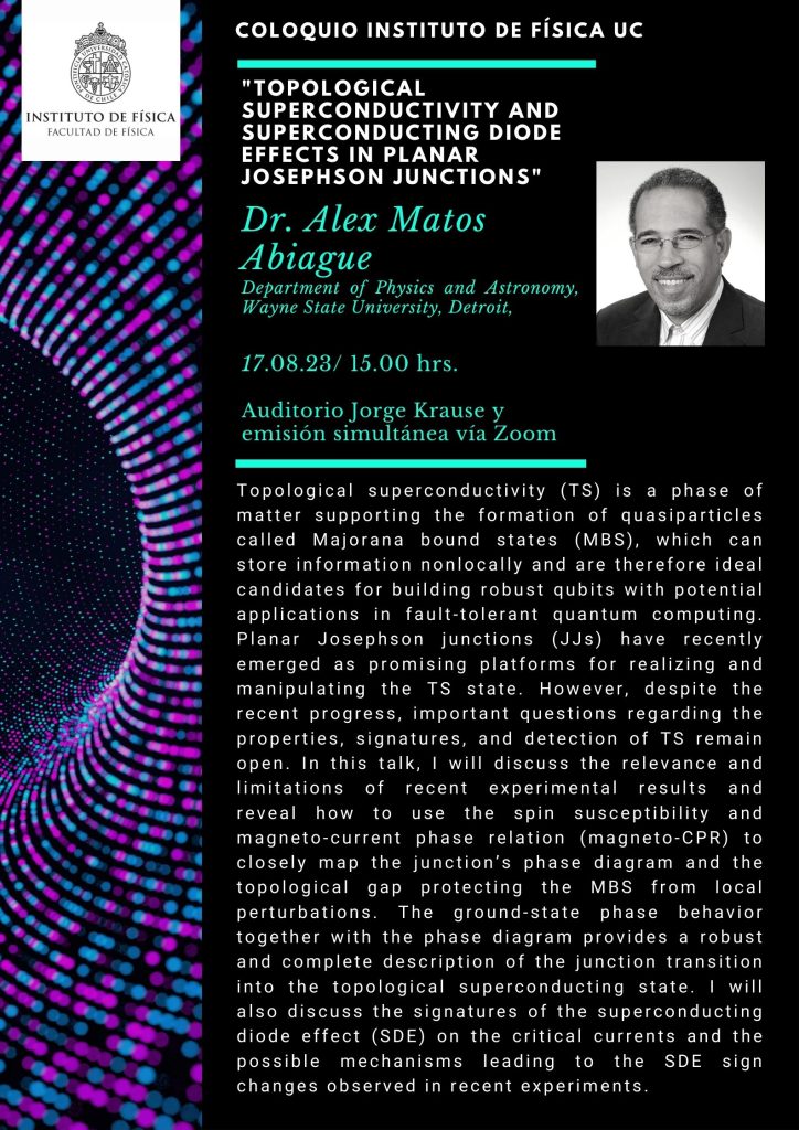 Invitamos a la comunidad del Instituto de Física UC a participar del coloquio “Topological Superconductivity and Superconducting Diode Effects in Planar Josephson Junctions”, a cargo del Dr. Alex Matos Abiague, del  Departmento de Física y Aastronomía de Wayne State University (Detroit).   Este se realizará el el jueves 17 de agosto a las 15:00hrs. de forma presencial y será transmitido vía zoom en el siguiente enlace: https://zoom.us/j/6604504127 .