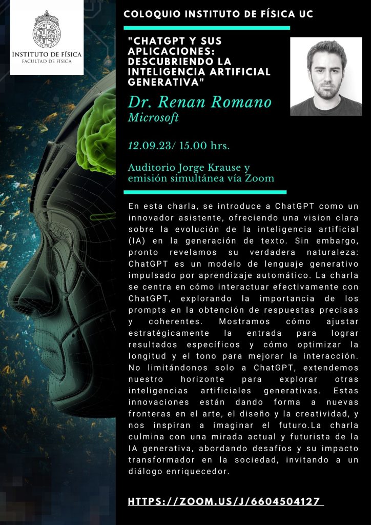 Invitamos a la comunidad del Instituto de Física a participar el martes12 de septiembre a las 15:00 hrs. del segundo coloquio de este semestre. En esta oportunidad tendremos al Dr. Renan Romano de Microsoft, quien nos hablará de “ChatGTP y sus aplicaciones: descubriendo la inteligencia artificial generativa”.