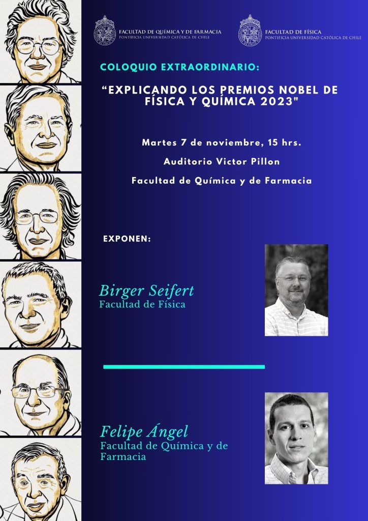 Invitamos a la comunidad del Instituto de Física a participar este martes 7 de noviembre a las 15:00 hrs de un coloquio especial acerca de los premios Nobel de Física y Química 2023. Esta iniciativa se realizara en conjunto con la Facultad de Química, en el auditorio Victor Pillon. Los charlistas serán los profesor Birger Seifert y Felipe Ángel.