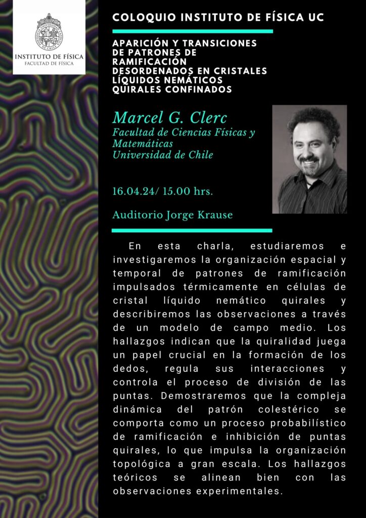 No te pierdas el coloquio “Aparición y transiciones de patrones de ramificación desordenados en cristales líquidos nemáticos quirales confinados”, a cargo de Marcel Clerc (16/04)