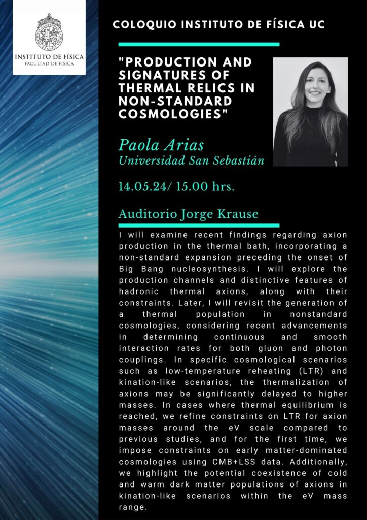 Invitamos a la comunidad del Instituto de Física a participar este martes 14 de mayo a las 15.00 hrs. del coloquio “Production and signatures of thermal relics in non-standard cosmologies”, a cargo de la investigadora Paola Arias de la Universidad San Sebastián.