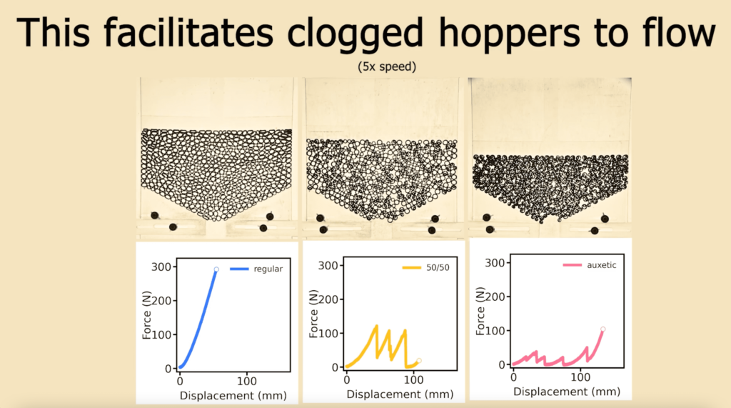 Sin embargo, los investigadores demostraron que con materiales auxéticos, estas fluctuaciones se producen más frecuentemente, pero son de menor magnitud por lo que rápidamente se rompen las cadenas de fuerza y tiende a menores niveles de atascamiento del material.