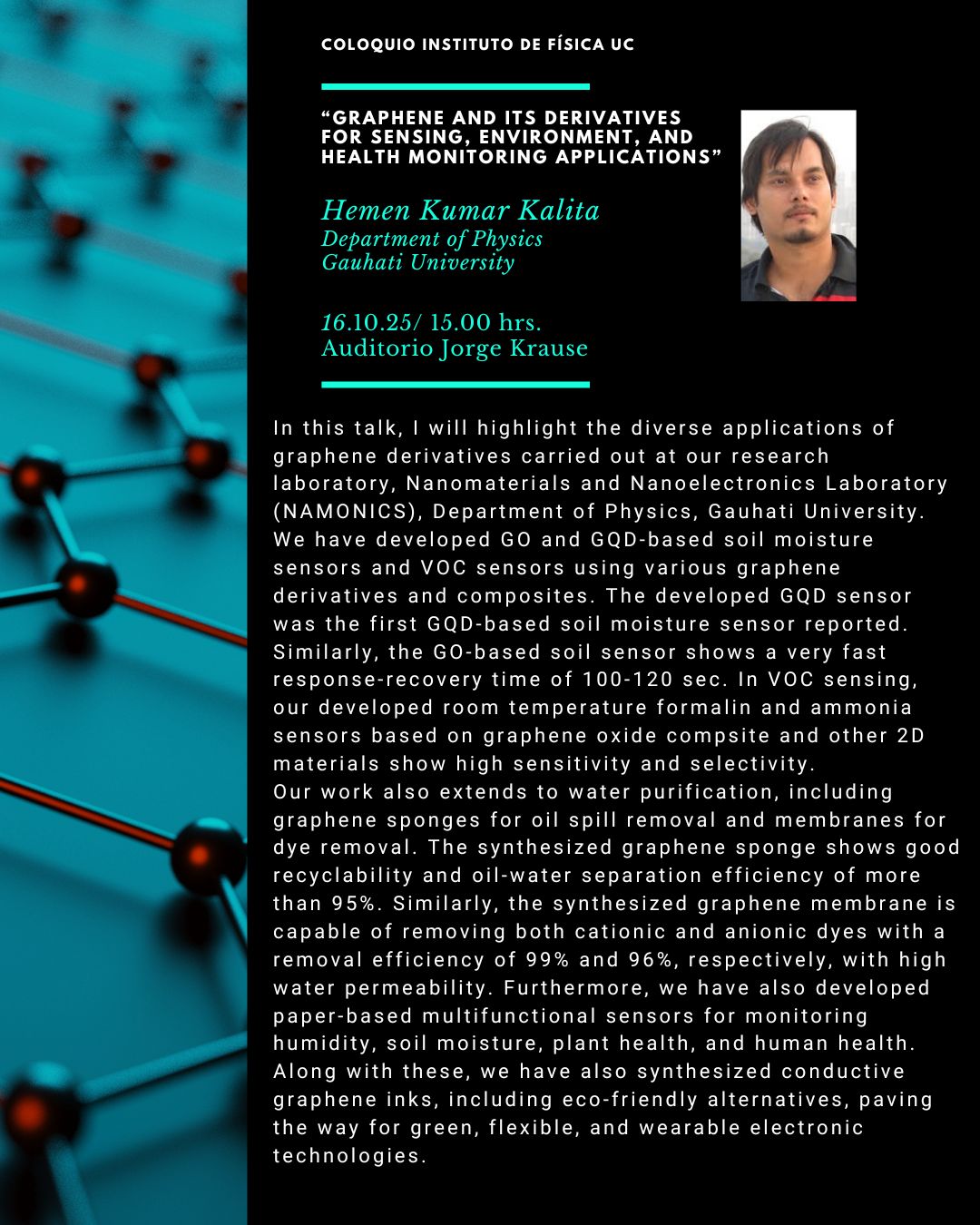 Invitamos a la comunidad del Instituto de Física a participar del coloquio “Graphene and its Derivatives for Sensing, Environment, and Health Monitoring Applications” a cargo del Dr. Hemen Kumar Kalita, de Gauhati University.